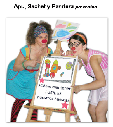 Para ello desarrollamos una obra de teatro, abordando el tema a través de un grupo de payasas ( Sachet y Pandora) quienes por medio del juego, la fantasía y el humor trasmitieron aspectos fundamentales como la necesidad de realizar actividad física, el consumo de alimentos ricos en calcio y el aporte del sol para lograr tener huesos sanos y fuertes.